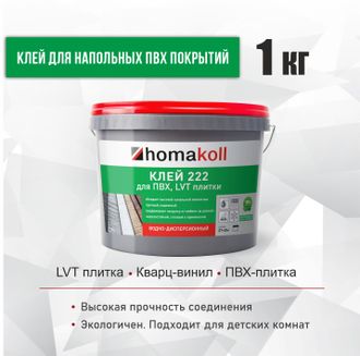 Клей для ПВХ и LVT плитки водно-дисперсионный Homakoll 222. Предназначен для приклеивания напольных модульных ПВХ-покрытий (LVT виниловой плитки, кварц-винила) и рулонных напольных покрытий на разных основах: вспененной, джутовой, войлочной и тканой. Клей Хомаколл 222 подходит для впитывающих воду оснований (бетон, цементная стяжка, дерево).