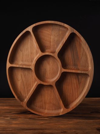 Менажница деревянная круглая для сервировки откроет для Вас новый уровень в презентации блюд на празднике! Это не просто тарелка, это настоящий инвентарь для кухни, который станет главным акцентом в вашем интерьере. Наша декоративная деревянная менажница круглая и большая. Она подойдет для любого случая, будь то романтический ужин или пикник на природе. Она идеально подходит для закусок, орехов и сыра, а также для подачи других блюд. Изготовленная из дерева, эта манежница - настоящее произведение ремесла, которое выглядит просто потрясающе! Наша доска для сервировки является не только функциональной, но и декоративной посудой, которая добавит вашему дому уют и тепло. Эта менажница деревянная - отличный подарок для друзей и близких, а также прекрасное приобретение для вашей коллекции посуды. Не упустите возможность порадовать себя и своих близких этим красивым и практичным блюдом для сервировки стола.