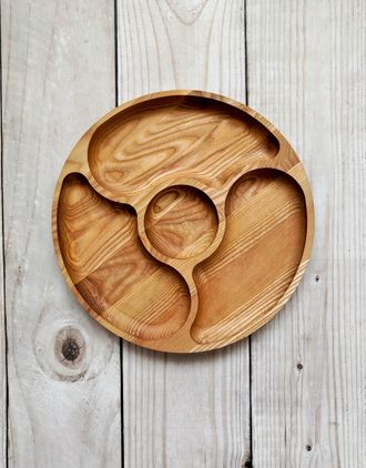 Менажница деревянная круглая для сервировки откроет для Вас новый уровень в презентации блюд на празднике! Это не просто тарелка, это настоящий инвентарь для кухни, который станет главным акцентом в вашем интерьере. Наша декоративная деревянная менажница круглая и большая. Она подойдет для любого случая, будь то романтический ужин или пикник на природе. Она идеально подходит для закусок, орехов и сыра, а также для подачи других блюд. Изготовленная из дерева, эта манежница - настоящее произведение ремесла, которое выглядит просто потрясающе! Наша доска для сервировки является не только функциональной, но и декоративной посудой, которая добавит вашему дому уют и тепло. Эта менажница деревянная - отличный подарок для друзей и близких, а также прекрасное приобретение для вашей коллекции посуды. Не упустите возможность порадовать себя и своих близких этим красивым и практичным блюдом для сервировки стола.